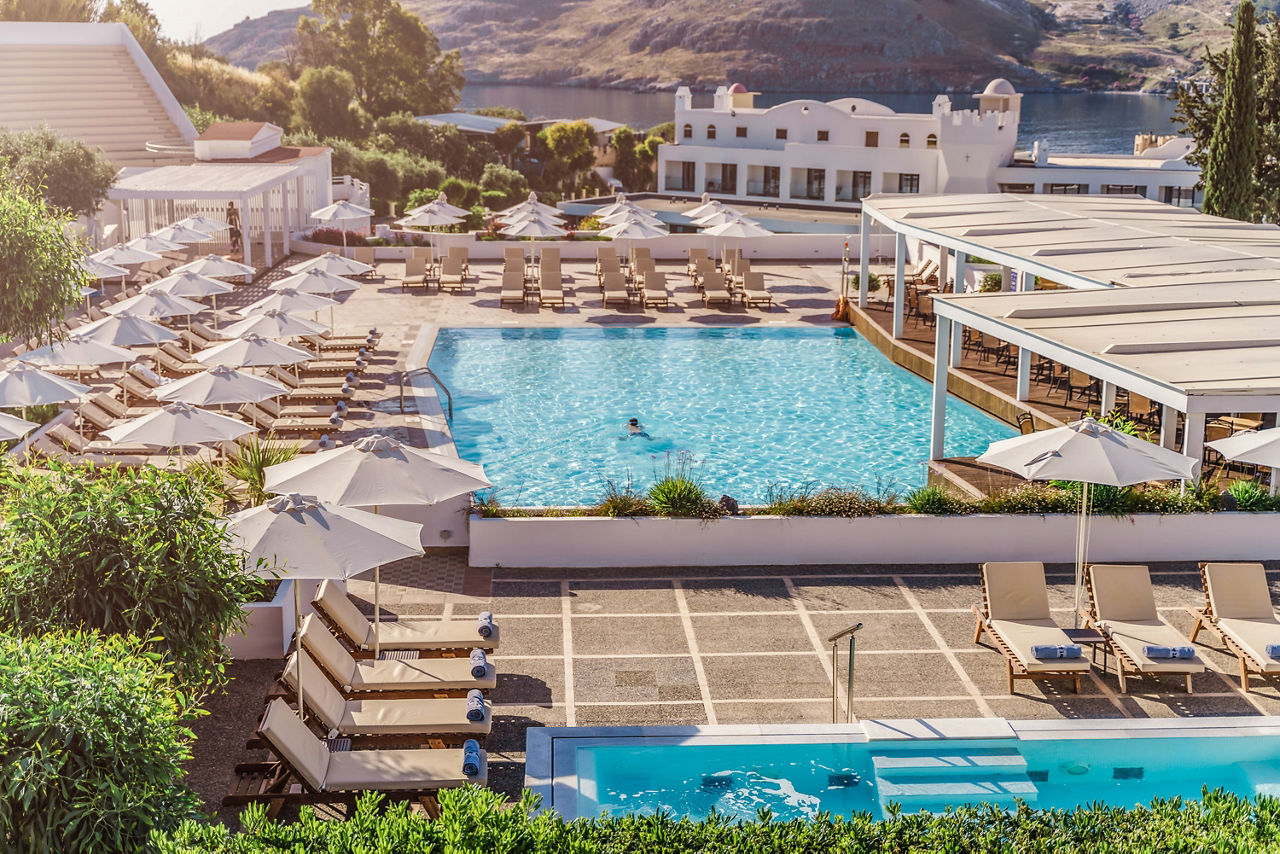 Encompassing features of a traditional Greek village, this homely hotel has all the trappings of a classic retreat. But it?s got its eye on the modern side too, with its swish rooms, serene pool area and flourishing gardens. Thanks to its hillside location, it?s got views nailed too. Talk about handy ? you?ll have a choice of rooms at Lindos Village ResortComfort rooms with Garden View sleep 2 adults and have bathroom containing a bath with shower attachment, air conditioning, hairdryer, flat screen television, fridge*, tea and coffee making facilities and balcony or terrace. Comfort rooms with Sea View, Junior suites with Garden View, Junior suites with Garden View or Sea View sleeping up to 3 adults, Suites sleeping up to 3 adults and Sole Use rooms are also available.