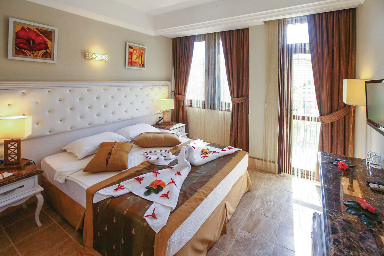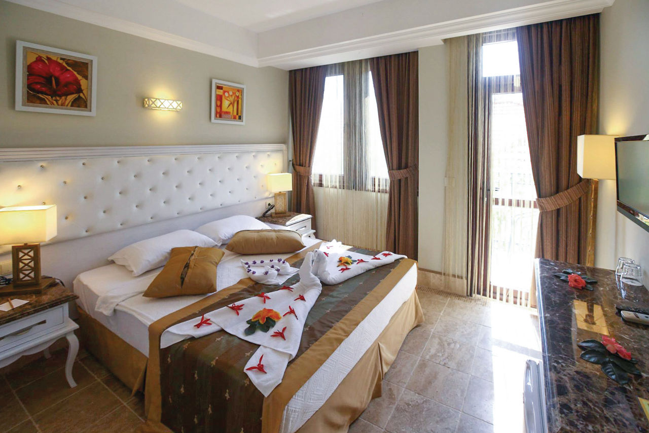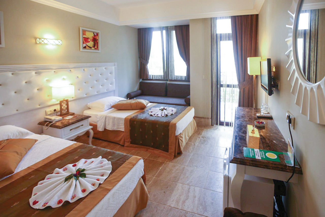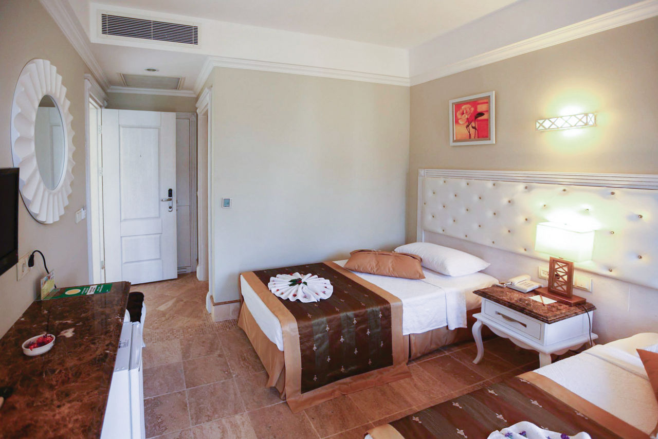 The adults only Telmessos Select Hotel is in a great location, close to the popular resort centre of Hisaronu and benefitting from stunning views of the surrounding pine forests. There?s a large pool area with waterslides, perfect for soaking up the sun by day, or for those looking for a pamper session, head to the chilled-out spa. Rooms are comfortable and bright with all the amenities you need, making this an ideal choice for couples and friends looking for an all inclusive getaway.Standard Double or Twin rooms sleep 2 adults and have bathroom containing a shower, hairdryer, air conditioning, flat screen television, coffee making facilities, safety deposit box* and balcony or terrace. Standard Double or Twin rooms for Sole Use are also available.